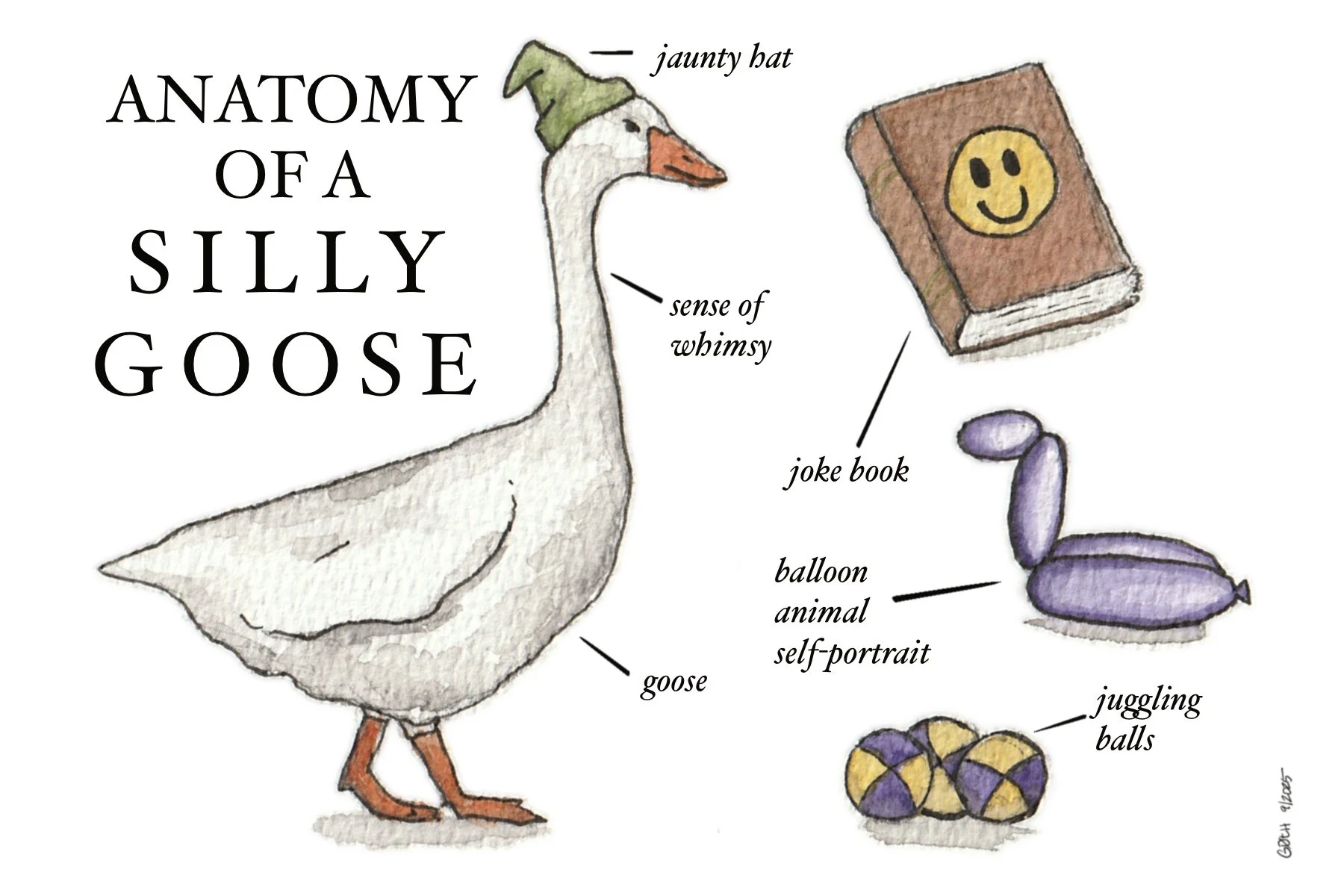 Anatomy of a Silly Goose. Watercolor and pen on paper.